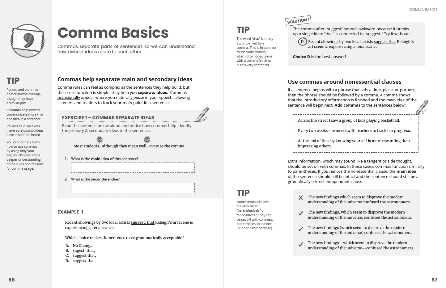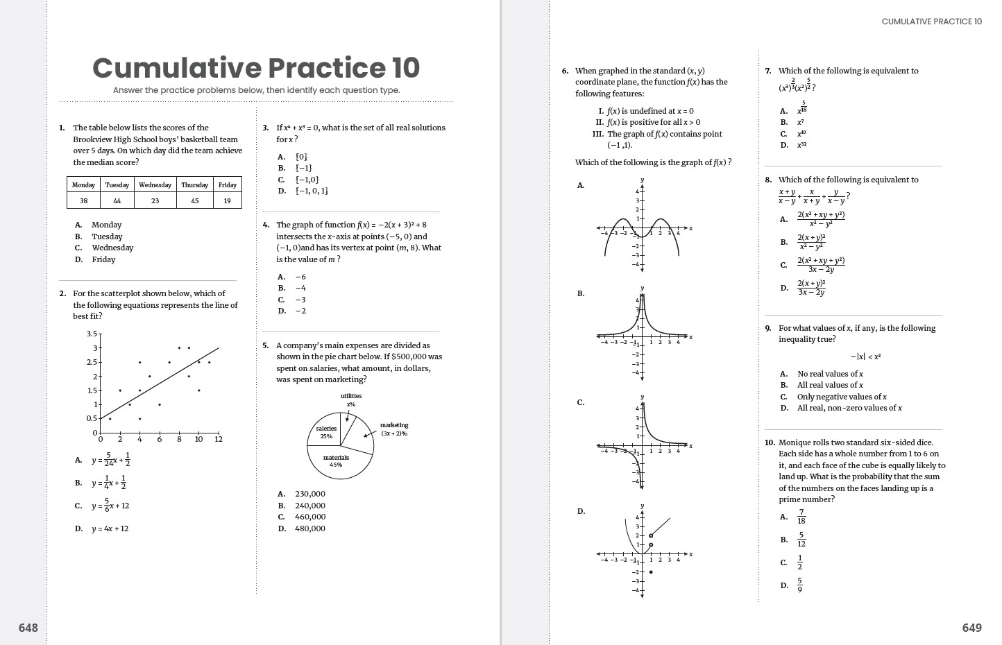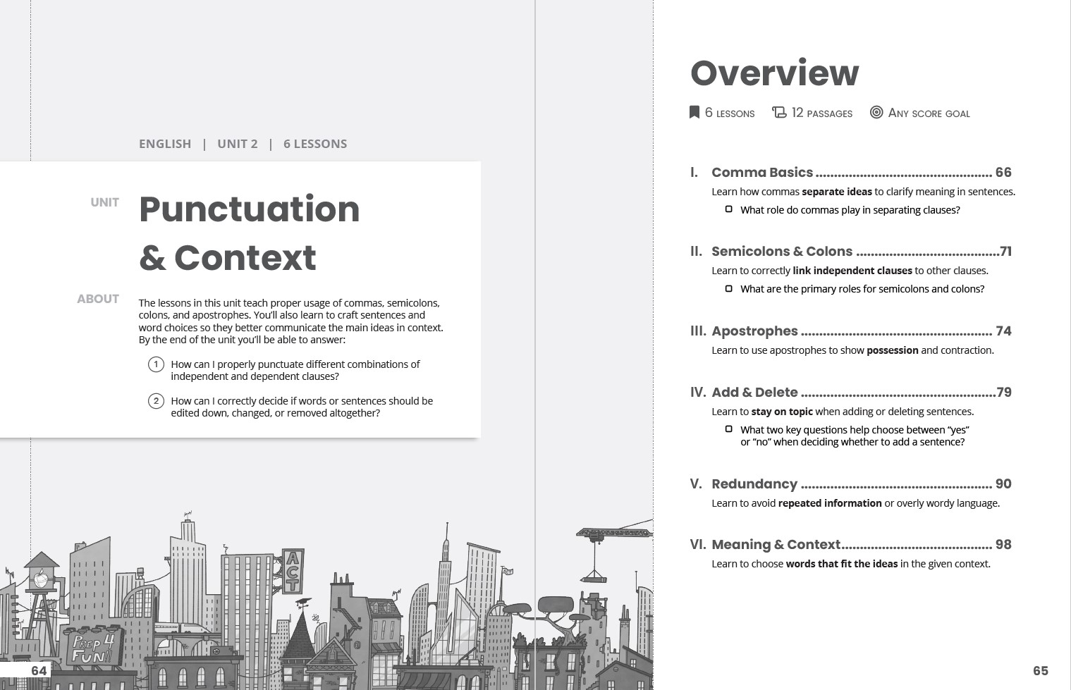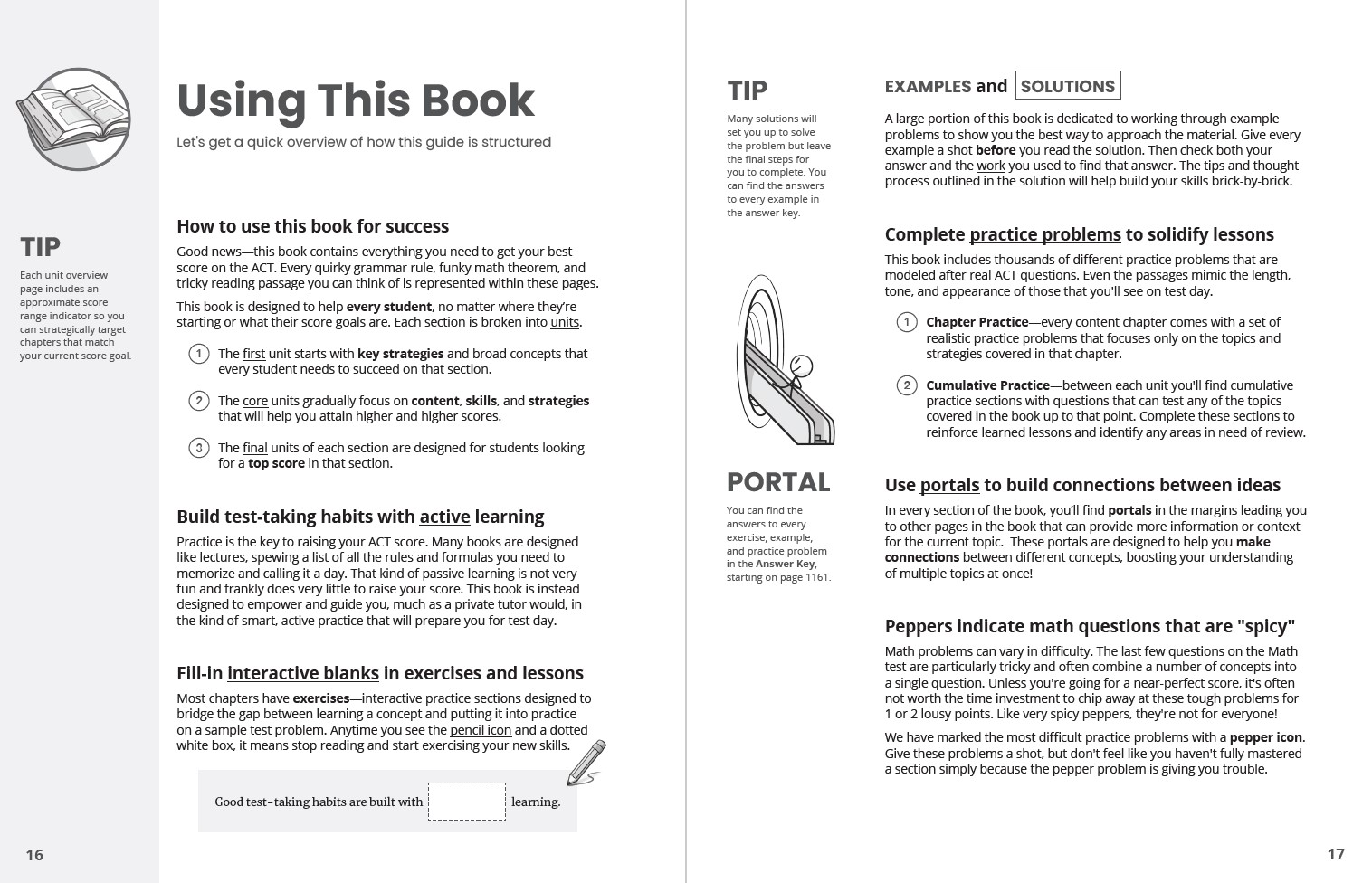 Skill-based progression – Early lessons focus on foundational knowledge, and later lessons progress to concepts and strategies needed for the most challenging ACT problems. This structure allows for intuitive customization of book materials to student abilities and needs.