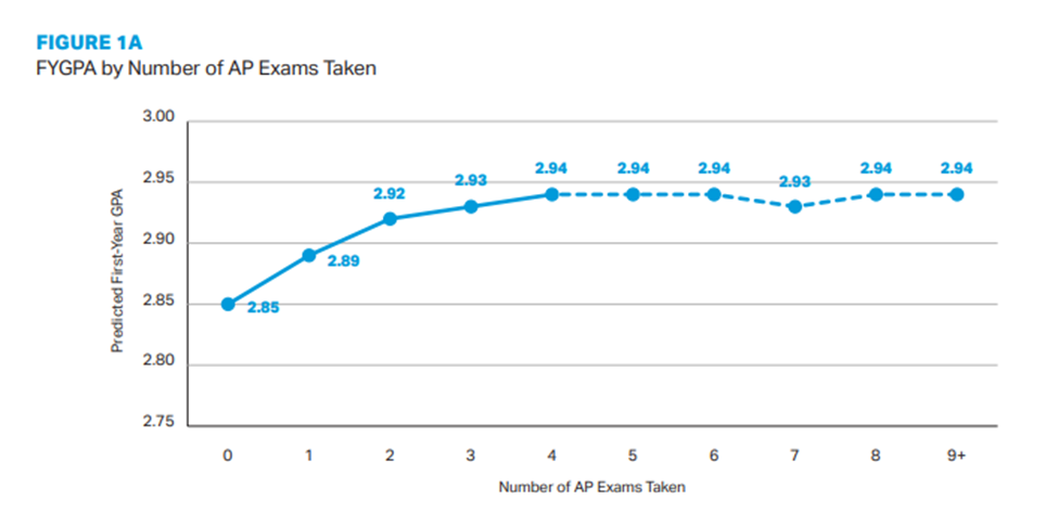 One striking finding from the College Board’s own research is that AP course-taking predicts higher college GPAs only through the 4th AP course. Taking more than 5 AP courses does not predict a stronger GPA in college.