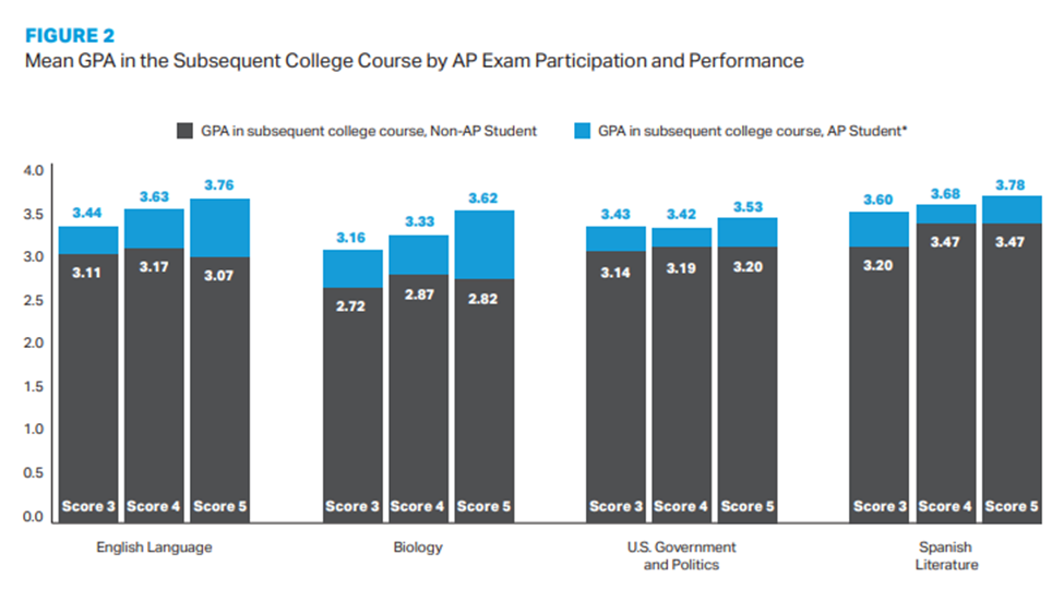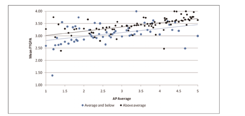 Other researchers have found the average score on AP exams to be a robust predictor of freshman grades in college. The higher the average AP score, the higher the college GPA.